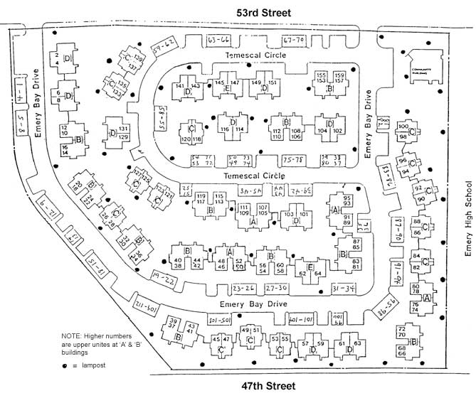 It’s hard to imagine that you are at the heart of the Bay Area when you stroll through Emery Bay Village. This unique condominium complex was completed in 1981. There are 113 units on two streets, Emery Bay Drive, and Temescal Circle. The natural setting is green, quiet and peaceful, yet the major freeways and the Bay Bridge are only a short drive away making this an ideal location. Units range from 2 to 4 bedroom Townhomes.