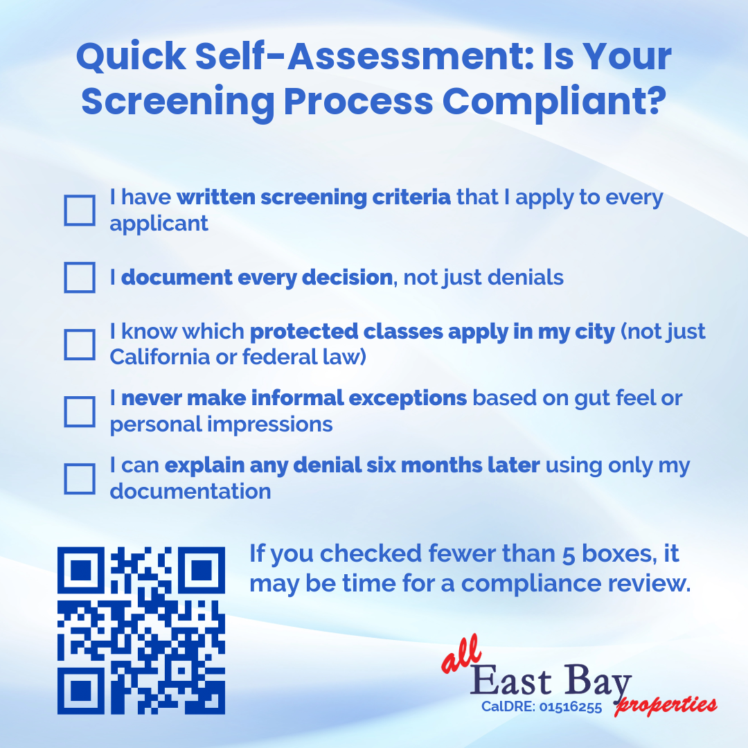 We offer a free 15-minute Fair Housing screening audit for Bay Area landlords—no obligation, no pressure. Sometimes one conversation can prevent years of legal headaches.
