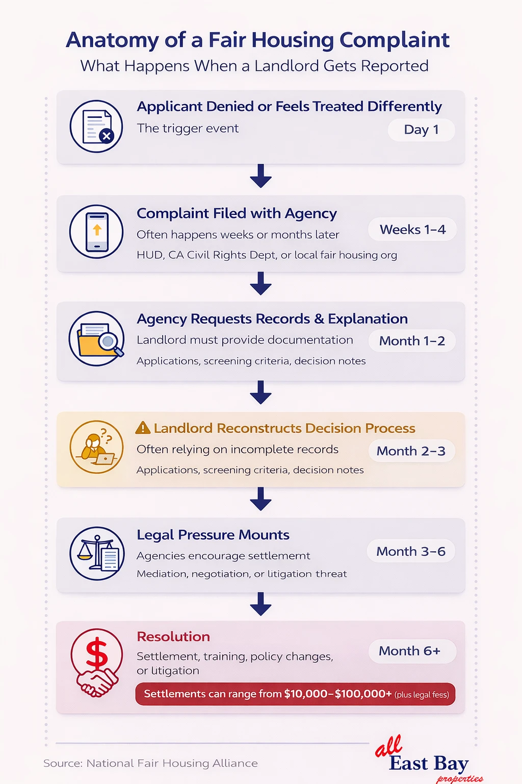 - A complaint is filed—often online through HUD, the California Civil Rights Department, or a local fair housing organization—sometimes weeks or months after the denial